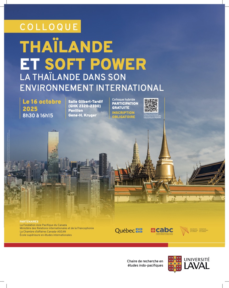 Par ses activités de recherche, la Chaire de recherche en études indo-pacifiques souhaite comprendre les enjeux géopolitiques et géoéconomiques de l’Indo-Pacifique et renforcer la formation et la recherche sur l’Asie au Québec.